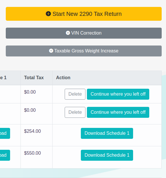 Previously filed 2290 returns, including the Schedule 1 document, will be available for download from your online account so you have the information handy for easy record keeping.